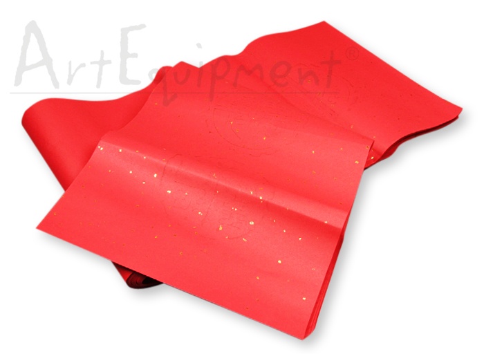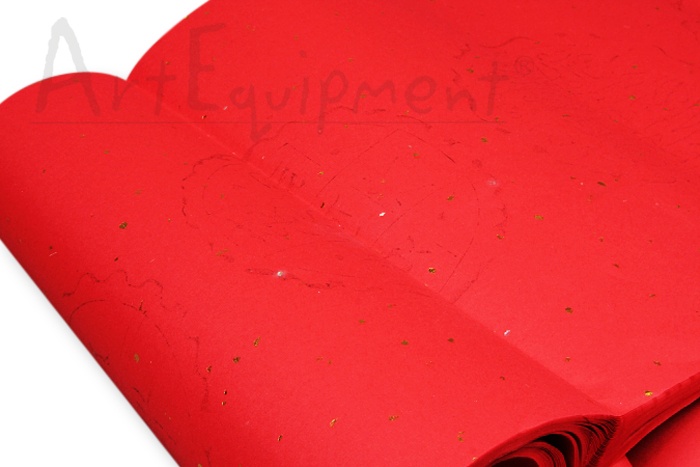 Dwustronny, czerwony papier ryżowy HAND MADE z jednej strony jest zupełnie gładki z drugiej posiada wtopione złote drobinki i delikatny zarys chińskich pieczęci. W głównej mierze przeznaczony jest do kaligrafii chińskiej i japońskiej - jego faktura doskonale wchłania tusz - jednakże można go używać również do wielu innych celów takich jak: konserwacja, modelarstwo, wystrój wnętrz, konstrukcja lamp i ścianek, decoupage.