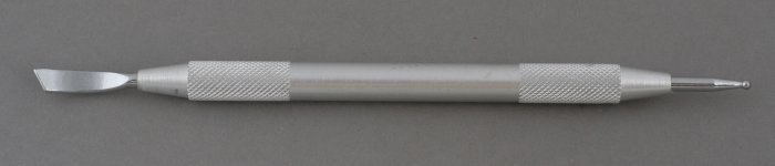 Narzędzie posiada aluminiową rączkę, stalowe końcówki, gładzik i kulkę 1,5mm.