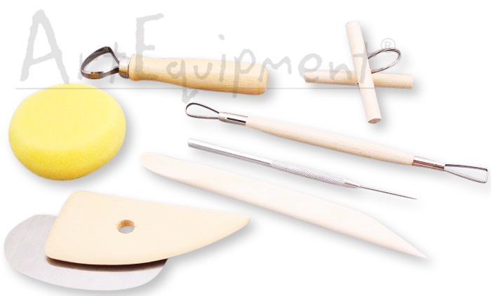 Komplet podstawowych narzędzi do modelowania w glinie, modelinie oraz innych masach plastycznych. Zestaw zawiera: gąbkę, strunę do przecinania, rysik, kość drewnianą, cyklinę stalową, szpatułkę drewnianą, oczko dwustronne i oczko jednostronne.
